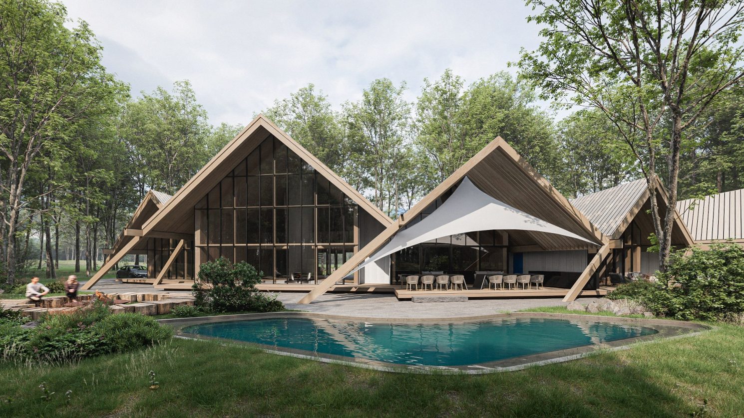 Strehe posameznih objektov so staknjenje. Posledica koncentrične zasnove je, da se objeki proti središču zapirajo (servisni prostori) in izven središča odpirajo v naravo (bivalni prostori), kjer ponujajo poglede. Zamik pogledo nui zasebnost. Objekt je dvignjen od tal. Arhitektura se tako spoštljivo odmakne od narave in ji pusti dihati.