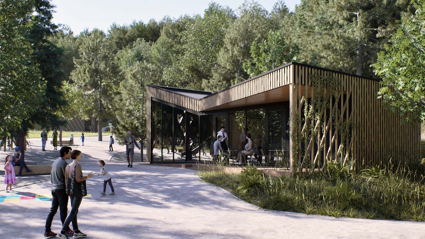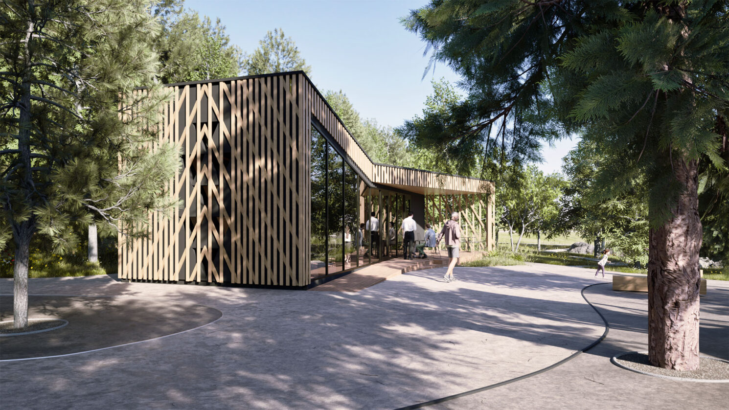 Paviljon je zasnovan kot zložena lesena forma – hibrid med skulpturo in zavetjem. Postavljen je ob potoku in ima pokrito teraso, usmerjeno proti bližnjemu ribniku. Terasa deluje kot družabni prostor, neposredno povezan z otroškim igriščem, kar jo naredi idealno za družinske obiske, dogodke ali vsakodnevno druženje. Fasada paviljona je oblečena v mrežo prepletenih lesenih letvic, ki črpajo navdih iz lokalne obrti pletenja košar – Pleteža – in ji dajejo naravno, zračno "kožo", prežeto s tradicijo.